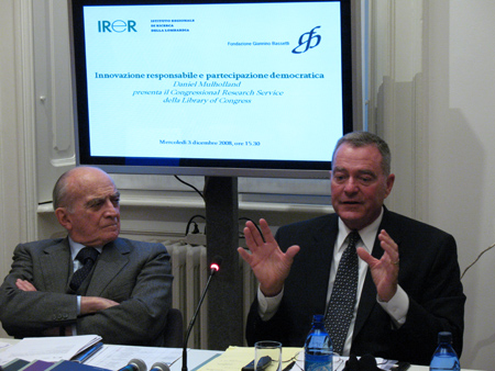 Daniel Mulhollan, Director of the US Congressional Research Service of the Library of Congress visited the Bassetti Foundation on Wednesday 3 December 2008 as part of the IRER (Regional Research Unit of Lombardy), "consultation forums as instruments of trust", coordinated by Alessandro Colombo, Director of Research.